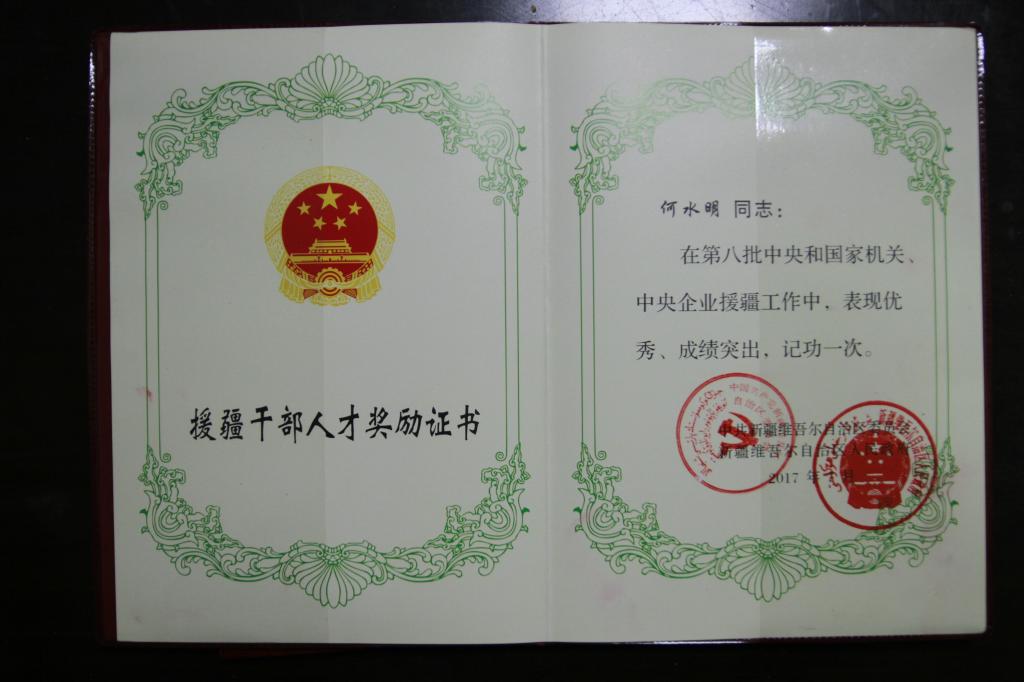 近日获悉,公司何水明同志被新疆自治区党委和政府评为“第八批中央和国家机关、中央企业优秀援疆干部人才”,并授予奖牌和奖章。