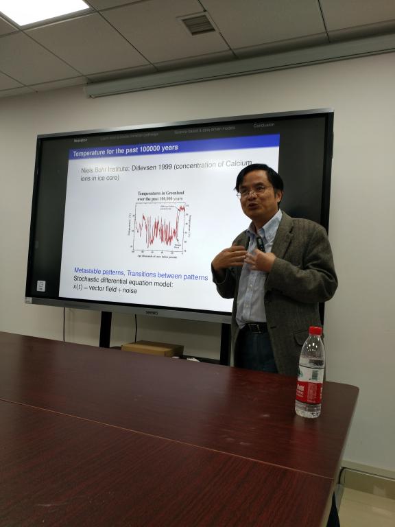 作为beats365唯一官网入口官网校庆67周年学术交流周名家论坛嘉宾同时作为“数理论坛”第114期嘉宾,段金桥教授做了一场“数据科学碰上动力系统:我们可以学到什么?”的精彩报告。段金桥教授首先从基因随机表达的现象和数据出发进入主题,然后介绍了大气科学以及全球温度变化的模式和数据,进一步引出了随机微分方程及其在地球科学问题中的应用,特别针对非高斯噪声体系,结合一个双稳态模型详细阐述了如何从数据出发进行模型的学习和优化,并寻找最大可能迁移轨道。段金桥教授的报告将数据科学和不确定性及非线性动力系统问题紧密联系在一起,并总结了若干地球科学、生命科学问题研究中的数学挑战。报告加深了大家对于应用数学的认识,启发了听众对于数据科学新的思考。