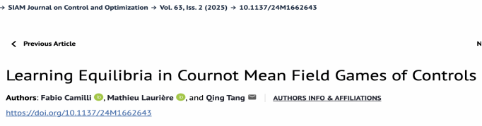 公司信息与计算科学系教师汤庆博士作为通讯作者的工作 “Learning Equilibria in Cournot Mean Field Games of Controls” 最近发表于SIAM Journal on Control and Optimization。