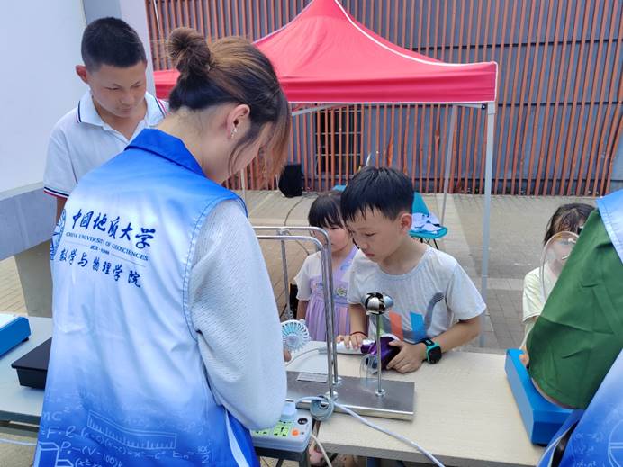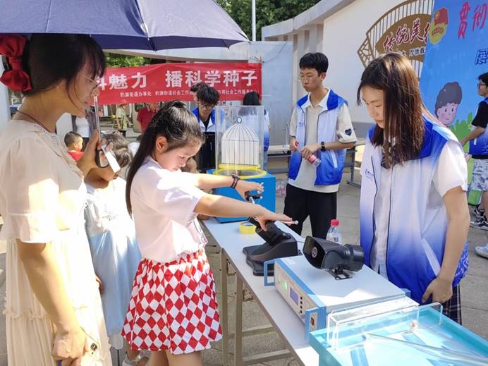 师生志愿者携带远程充电、闪光灯演示电容储能、磁悬浮马达、角动量守恒演示仪、记忆合金、转动惯量演示、穿墙而过、视觉暂留—笼中鸟、动画原理、椎体上滚等十余件科普实验仪器,顶着炎炎烈日与中小员工耐心交流,指导中小员工学习物理实验仪器。街道近百余名中小员工享受了此次科学盛宴。豹澥街道团工委、豹澥街社工站、九龙湖社区对此次活动表示高度赞扬和认可。同时豹澥街愿意创造条件,欢迎地大师生及志愿者们将更多公益科普活动带到豹澥街。